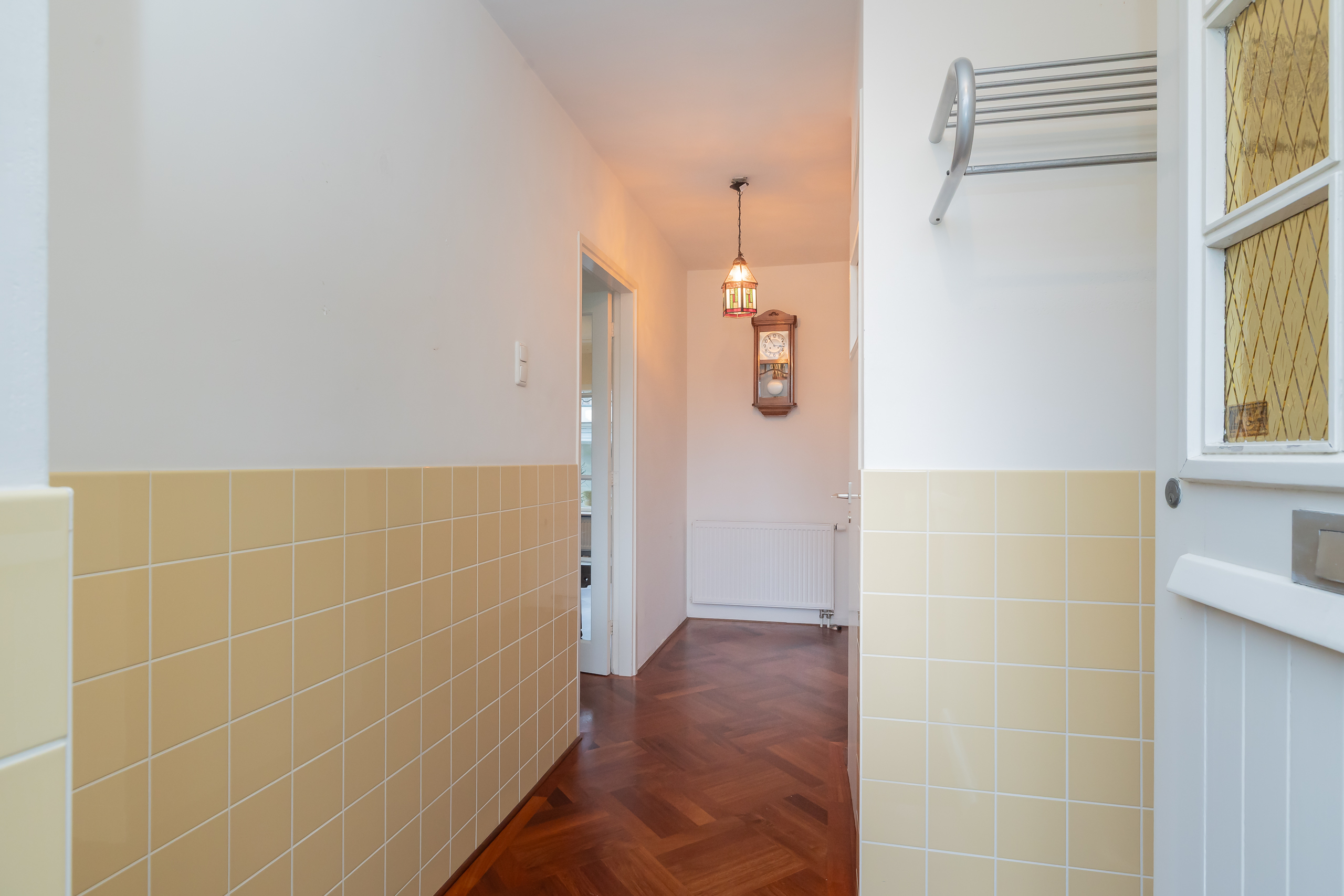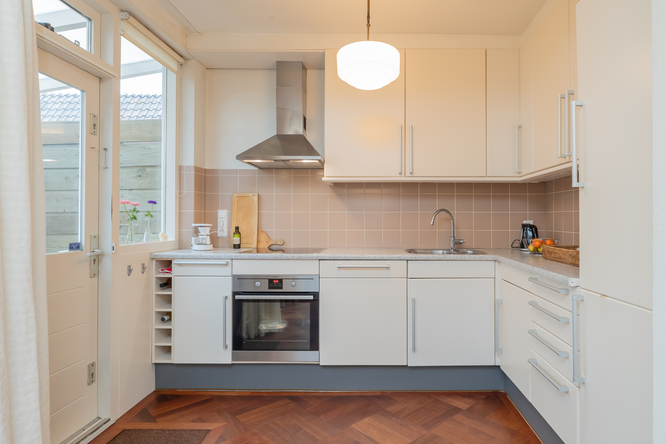 Entree/hal met toiletruimte en ruime trapkast. Ruime en lichte woonkamer met sfeervolle erker, waardoor er veel daglicht binnenvalt. De woonkamer is voorzien van karakteristieke mozaïek parketvloer. De open keuken beschikt over diverse inbouwapparatuur en staat in verbinding met de woonkamer, wat zorgt voor een prettige leefomgeving.