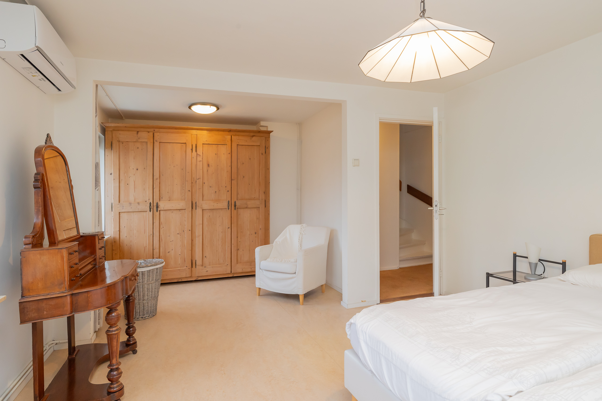 Hier bevinden zich 2 ruime slaapkamers (oorspronkelijk 3 slaapkamers). De royale hoofdslaapkamer is vergroot door aanpassing van de oorspronkelijke indeling en is voorzien van een inbouwkast en airconditioning. De tweede slaapkamer is gelegen aan de voorzijde van de woning en beschikt over een inbouwkast en authentiek balkon. De badkamer is geheel betegeld en ingericht met een douchecabine, ligbad, toilet en wastafel.