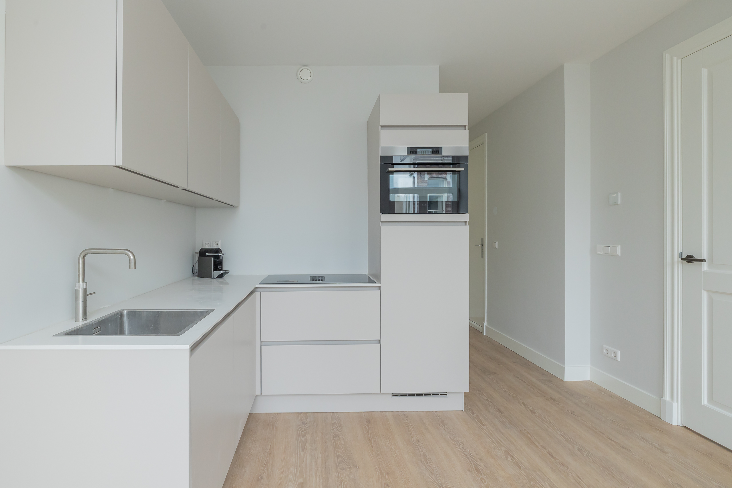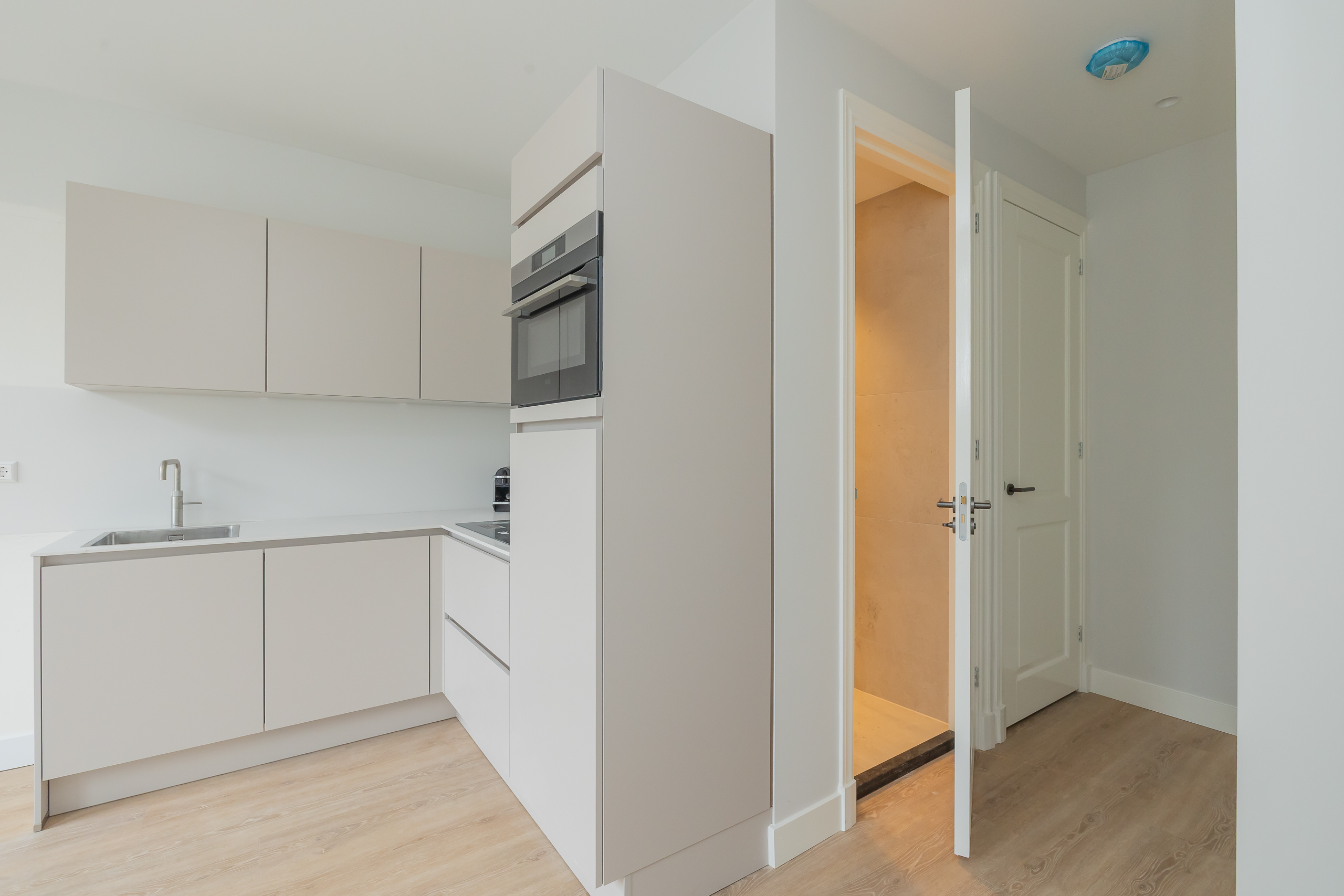 De lichte woonkamer heeft een prettige, efficiënte indeling met moderne open keuken. Deze is uitgevoerd met hoogwaardige inbouwapparatuur, waaronder een Quooker, combi-oven, vaatwasser en een inductiekookplaat met geïntegreerd afzuigsysteem. De gehele woning is afgewerkt met een PVC vloer met vloerverwarming, strak gestucte wanden en inbouwspots. De slaapkamer is gelegen aan de voorzijde en meet ca. 1,87 x 3,88 meter. De moderne badkamer is volledig betegeld en stijlvol uitgevoerd met een wastafelmeubel met luxe inbouwkraan, een zwevend toilet en een inloopdouche. De wasmachine en droger staan opgesteld in de technische ruimte.